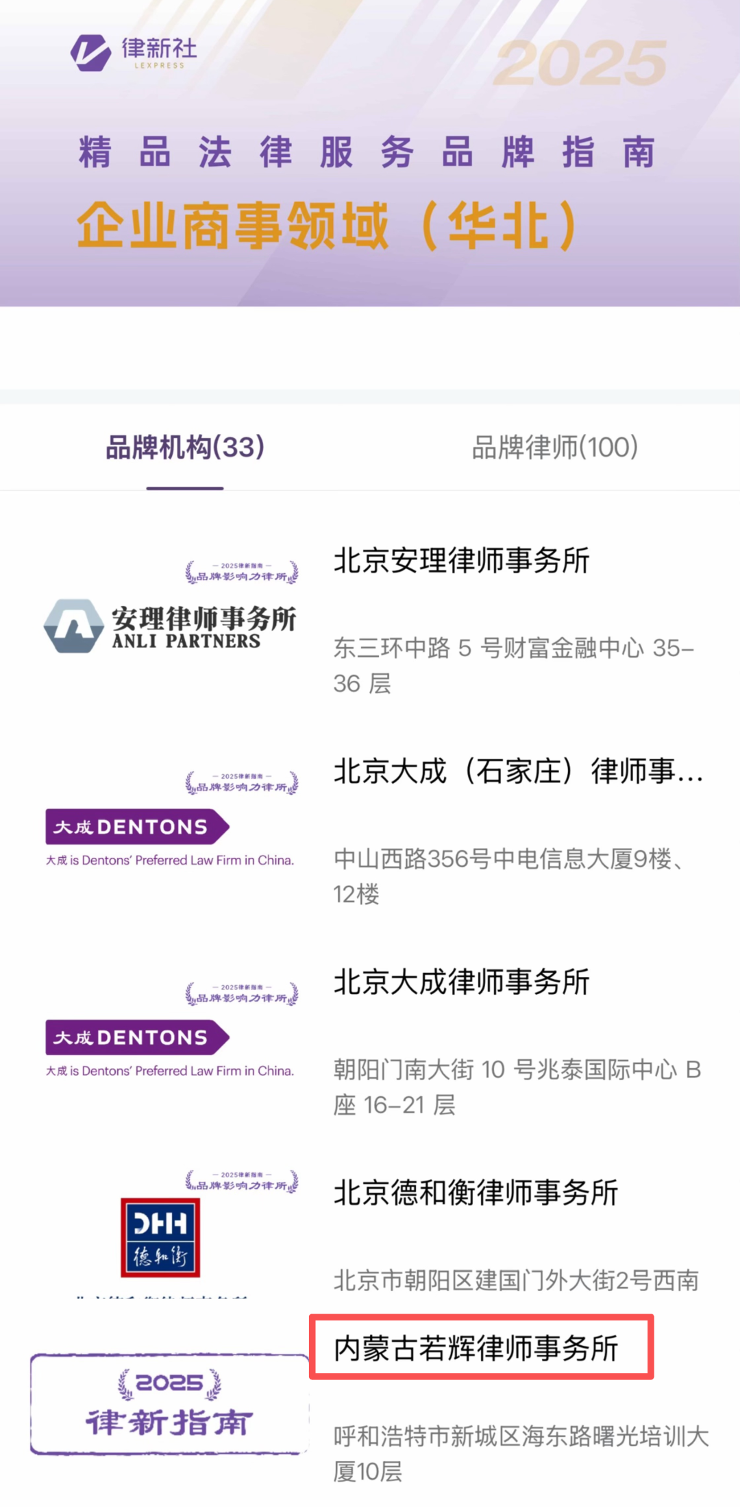 2025年12月,若辉所荣获律新社2025年度华北地区“企业商事领域品牌影响力律所”