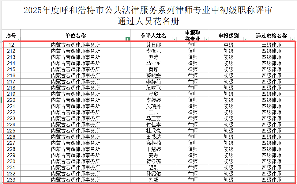 近日,内蒙古自治区2025年度律师专业职称评审结果已发布,经严格评审与综合评议,内蒙古若辉律师事务所共有24位律师凭借扎实的专业功底、突出的实务业绩与良好的职业素养,成功获评相应级别职称。
