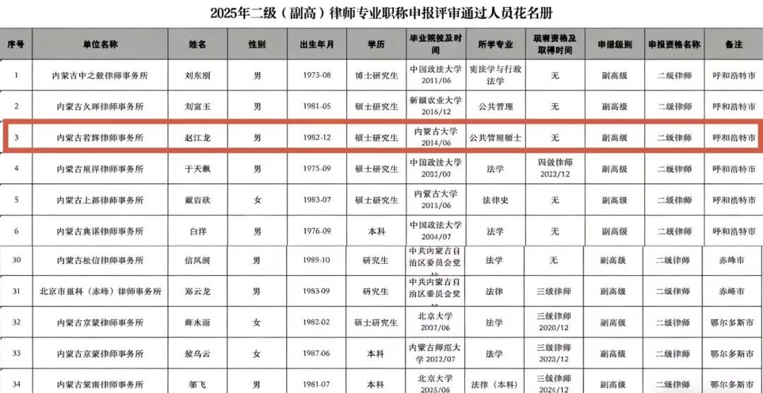 其中赵江龙律师获评二级律师职称;莎日娜律师获评三级律师职称;纪啸飞律师、吴瑞丹律师、马亚丽律师、刘超律师等22位律师获评四级律师职称。